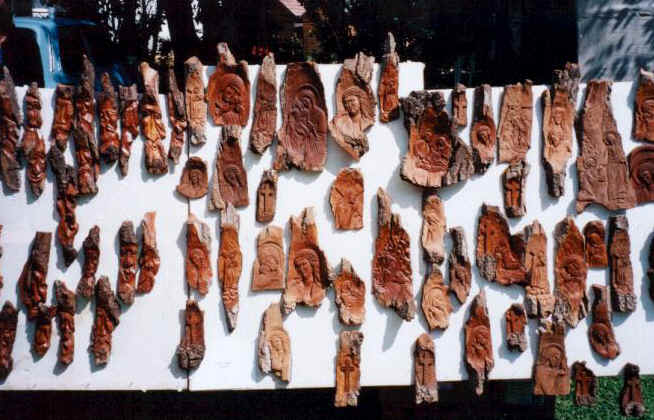 sculpted on tree bark, some are religious things but some are just random faces of creepy old men