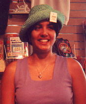 Daikiri tries on hats in the ferry store.