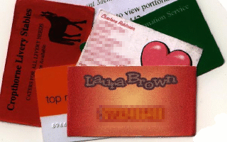 Assortment of cards. I've got an address/phone number card from Lennie and Laura (which i've scrambled so u crafty people can't get their numbers! An orange top-up card, a library card (which has never been taken out), a Cropthorne Livery Stables business card, An "Animal Portraits by Rebecca Way" card. Her portraits are amazing! She came up to Mel's for a lesson once and showed us her pictures. |