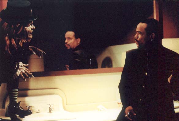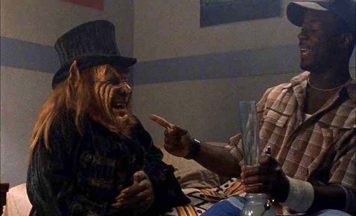 Leprechaun in the Hood is radically different from the first four movies. Despite some surreal touches in the opening sequence and some other light moments, it's basically a straight horror movie rather than a camp cheesefest. Although it does have Leprechaun rhymes and some jokes and sight gags, on the whole it's quite serious. Most of the time, the Leprechaun acts purely sinister, without the demented glee that we're accustomed to. He's also a lot more patient and methodical than his previous incarnations.