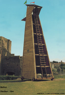 A belfry or siege tower was used to attack the castle walls during the final days or hours of a siege or battle. Once the garrison was "softened up" by the bombardments of the siege artillery, the belfries would roll up to the castle wall and open its top gate. The attackers would climb up the siege tower while being protected and storm the walls. If there was a moat, the attackers would fill it in and create a land bridge to the wall. At the same time, another group of attackers would storm the gatehouse in an atttempt to take the castle that way. to Hopefully, the charges would be a success. Sometimes, it wasn't. In the later years of the Middle Ages, people invented ways of rigging a bucket full of burning tar on the end of a long pole so they could safely attack the belfry while on the other sides of the wall. There were also hooks that could latch onto the bottom and upturn the thing. So even though the belfries were a very valuable weapon, they could be destroyed by the simplest method.