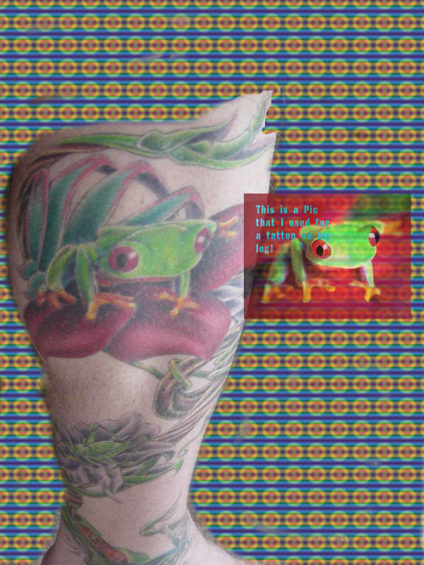 The picture of my leg was pattern stamped to cover background and the original frog picture was made 50 transparent and dragged to merge it with the other image.