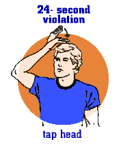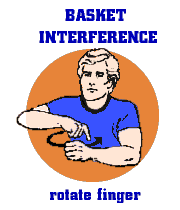 BASKET INTERFERENCE: Touching the basketball when it is on the rim or in the imaginary cylinder above the rim. BLOCKING: Illegal contact that impedes the progress of an opponent. CANCEL SCORE/CANCEL PLAY: To disallow the preceding basket or play. CHARGING: An offensive foul that occurs when a player runs into a stationary defender who has position. TO DESIGNATE OFFENDER: The number of the player called for foul or violation to the official scorer. DIRECTION OF PLAY: The direction of the basket of the team awarded possession. DOUBLE FOUL: When two opposing players commit personal or technical fouls against each other at approximately the same time. GOALTENDING: An offensive or defensive violation in which a player interferes with a shot ball while it is on a downward arc to the basket. If a defender goaltends, the offensive team is credited with the made goal; if an offensive player goaltends, any goal is void and the defensive team receives possession. HOLDING: Illegal physical contact that impedes the progress of an opponent. ILLEGAL DRIBBLE: When a player runs with the ball without dribbling, or dribbles a second time after he has voluntarily ended his first dribble. ILLEGAL SCREEN OUT OF BOUNDS: A player illegally leaving the playing floor on the endline in the frontcourt for the purpose of setting a screen. ILLEGAL USE OF HANDS: Illegal hand contact or "hand-checking" of an opponent. JUMP BALL: To put the ball in play with a jump ball between two opposing players after such occurrences as a held ball. LOOSE BALL FOUL: Illegal contact after the ball is live when team possession does not exist. PERSONAL FOUL: Illegal physical contact with an opponent when the ball is live. PUSHING: Such personal contact as bumping or moving an opponent. TECHNICAL FOUL: A penalty for unsportsmanlike conduct or violations by team members on the floor or seated on the bench. It may also be assessed for illegal contact that occurs with an opponent before the ball becomes live. THREE-SECOND VIOLATION: A violation in which the offensive player stands in the free-throw lane for three seconds or more without commencing a shot. TRAVELING: Illegal movement in which a player in possession of the ball pivots, jumps, or shuffles the feet improperly. 24-SECOND VIOLATION: A violation in which the offensive team fails to attempt a field goal within 24 seconds after gaining possession. TIME-IN AND TIME-OUT: Signals to the timer when to start and stop, respectively, the official game clock. 20-SECOND TIMEOUT: Signals the granting of a team's request for a 20-second time-out. Teams are allowed one 20-second timeout per half.