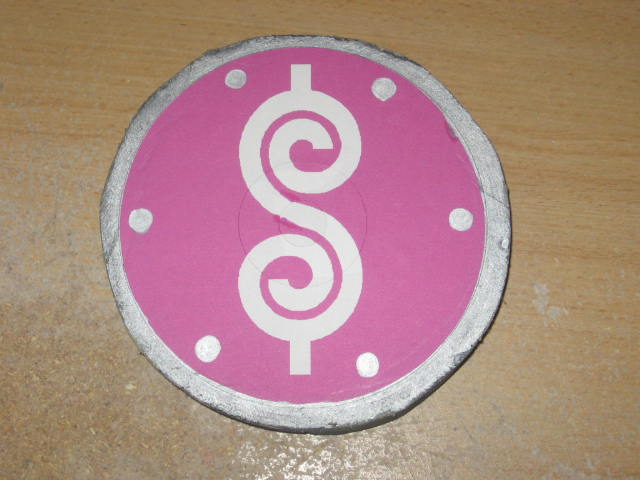 My homemade Plinko chip replica. Made of wood. The pink sides wit the dollar signs are printed on CD labels. The silver edging is made with a silver Sharpie marker.