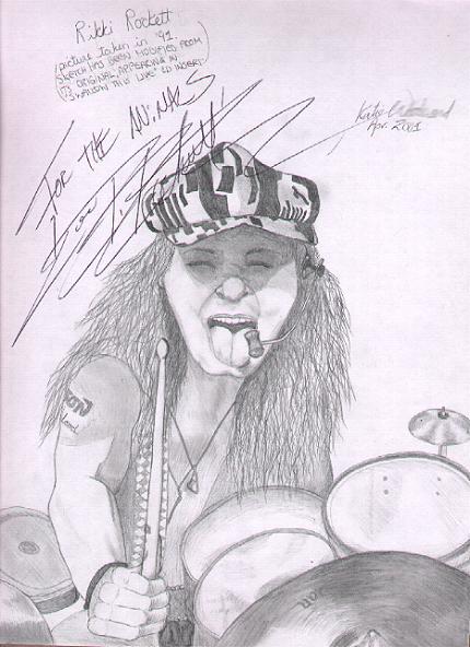 I wanted Rikki to sign something important to me... it was a sketch I had worked on and agonized over, done of him a few months back. He wrote "For The Animals, Love Rikki Rockett" on the upper corner (as seen below).
