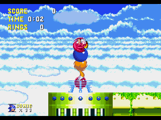 If you loved fighting Knuckles in the Hidden Palace zone, you going to enjoy Sky Sanctuary. In this stage, you get to battle Metal Sonic high up in the clouds! But beware, as this would be the last stage for Knuckles ONLY, it will be quite difficult for those playing Knuckles ----- for you will have to fight not only Metal Sonic, but also SUPER metal Sonic. Don't fret, it's not that hard actually. For Sonic players, you only fight Metal Sonic at the last part. Even though this stage has only one act, it has three bosses for you guys using Sonic. About this stage: there is only one badnik which is a 'copy' of Robotnik with jet boosters, only that is has a metalic head. This guy shoots laser beams.
