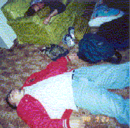 Father Lynch, Bean, D-Lang, Hayes, Brad, and Joe eat breakfast.