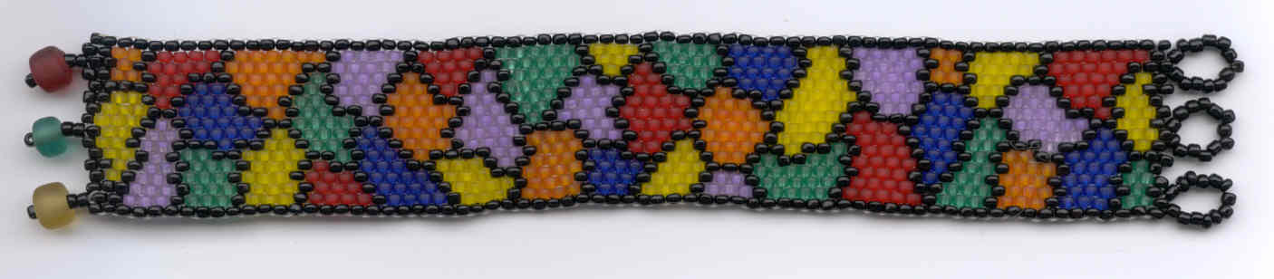 Peyote stitch bracelet with a stained-glass look that I made for Shoshana's birthday. The very first peyote object I've made that was also designed by me! I'll post the pattern soon.