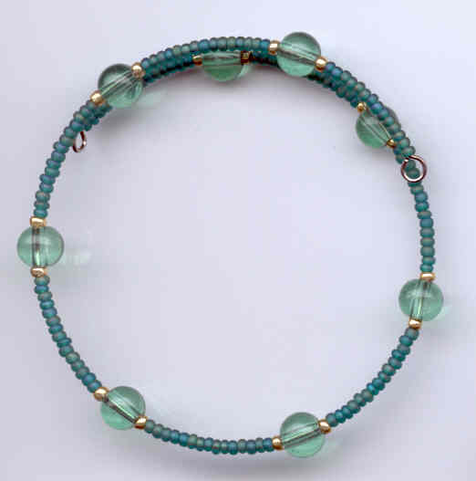 Single-soil memory wire bracelet, blue-green and gold seed beads with green glass rounds. Belongs to Russell :)