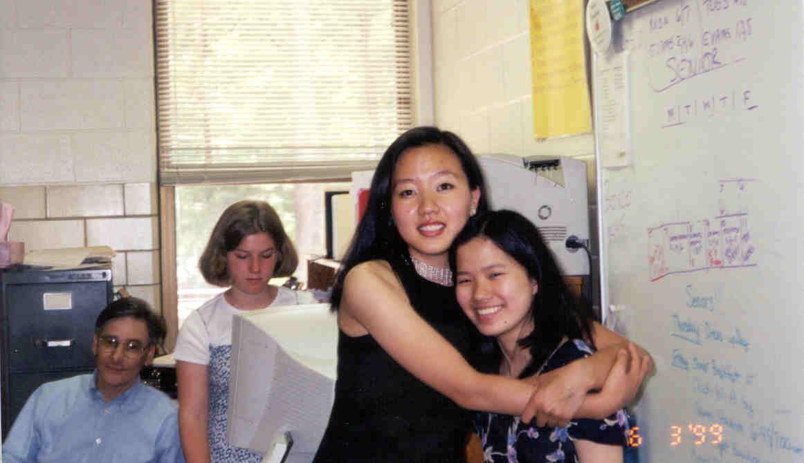 We in AP calculus. Poor, poor Mr. Koff. Foreground: Mia hugging Nancy. Background: Vicky, Mr. Koff.