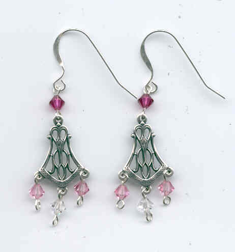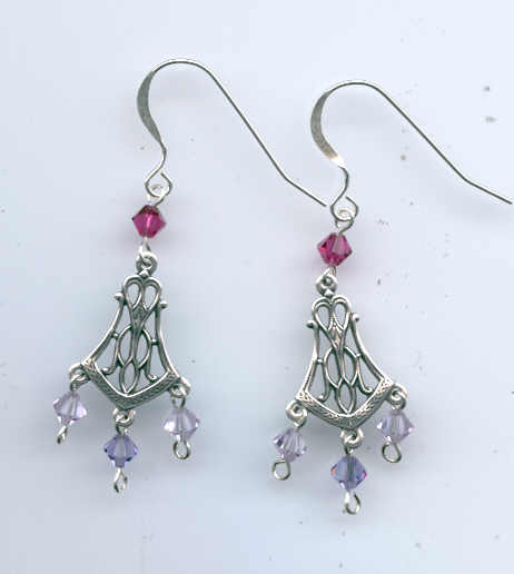 Two variations of the same earring style, in different colors. Sterling earring wires, Swarovski crystals, and silver-plated connector charms. The pink pair on the right was a gift for Aimee; the blue/purple pair was sold for $7.