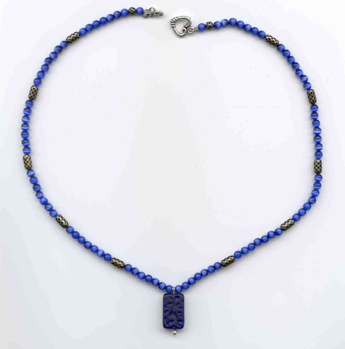 Blue cat's eye beads, small metal cylinders, and a textured pendant. Sold for $10.