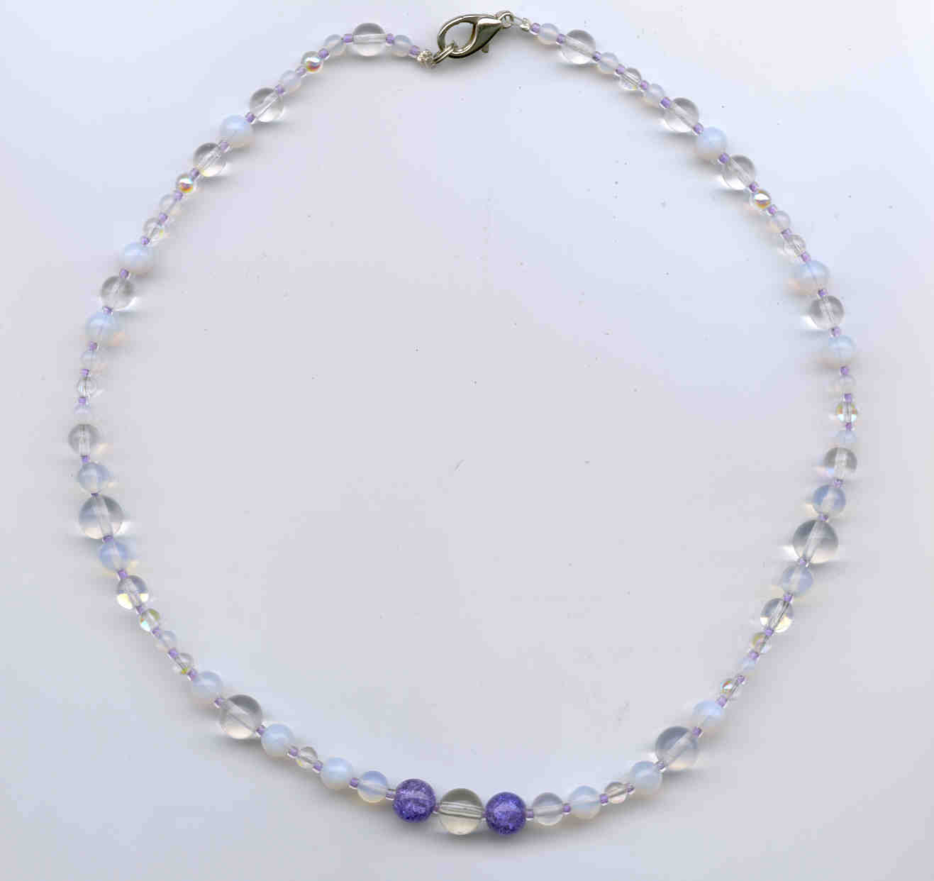 Opalescent milk glass beads, clear and A.B. beads, and amethyst crackle beads. Sold for $10.
