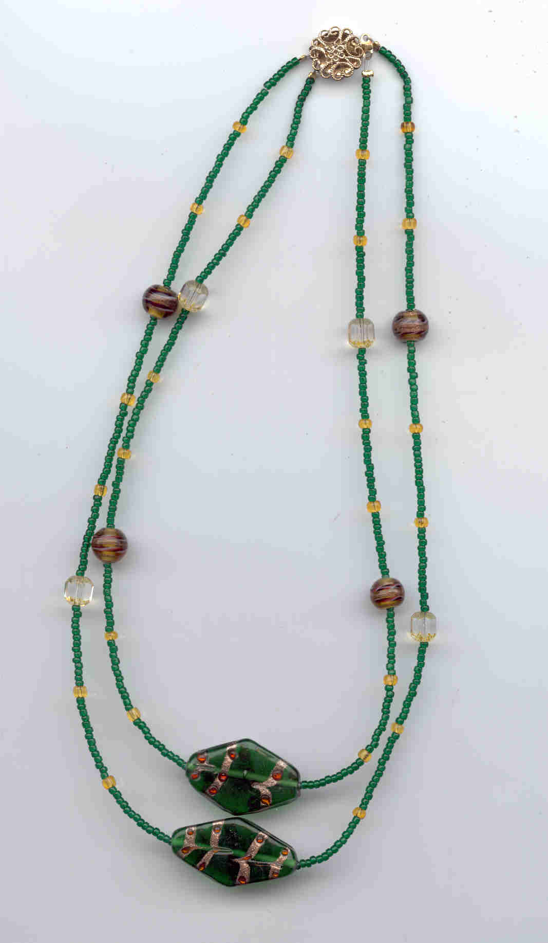 Seed beads with accents and large Indian green-and-gold beads with antique clasp. Sold for $10.