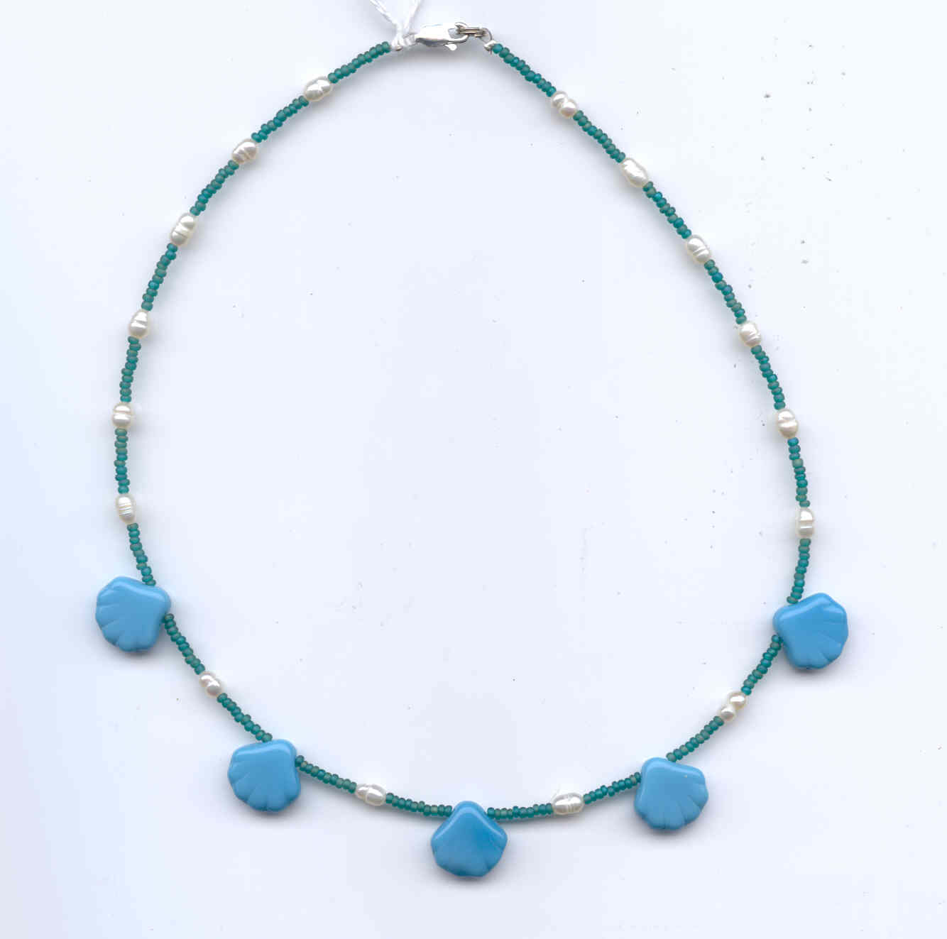 A netweave necklace, with glass seed beads, freshwater pearls, and sterling toggle.