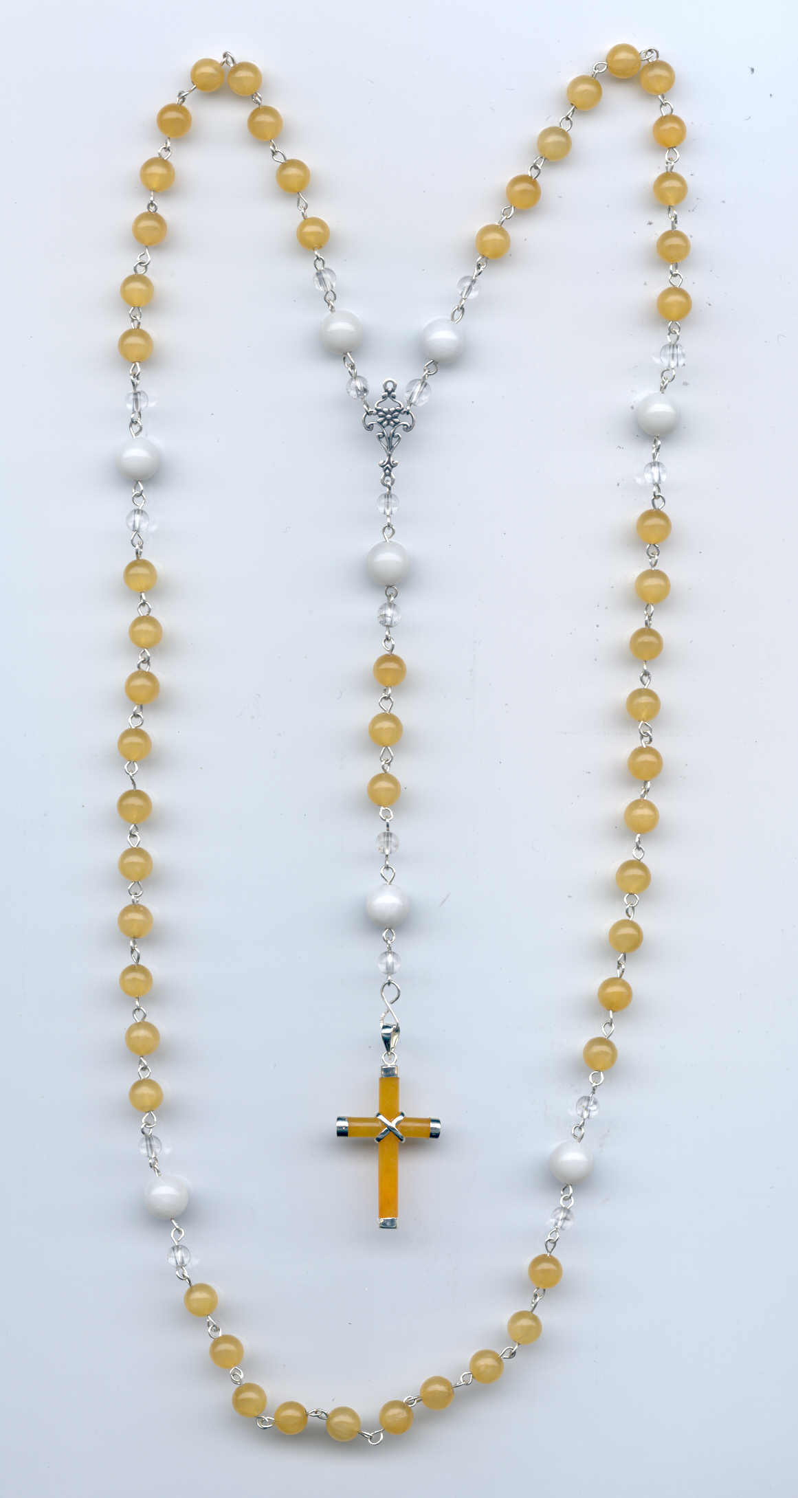The rosary I made for Russell's grandmother's birthday. The cross is yellow jade in sterling silver setting, and the beads are honey jade and snow and clear quartz. All strung on silver-plated or sterling wire. I'm very proud of this one.