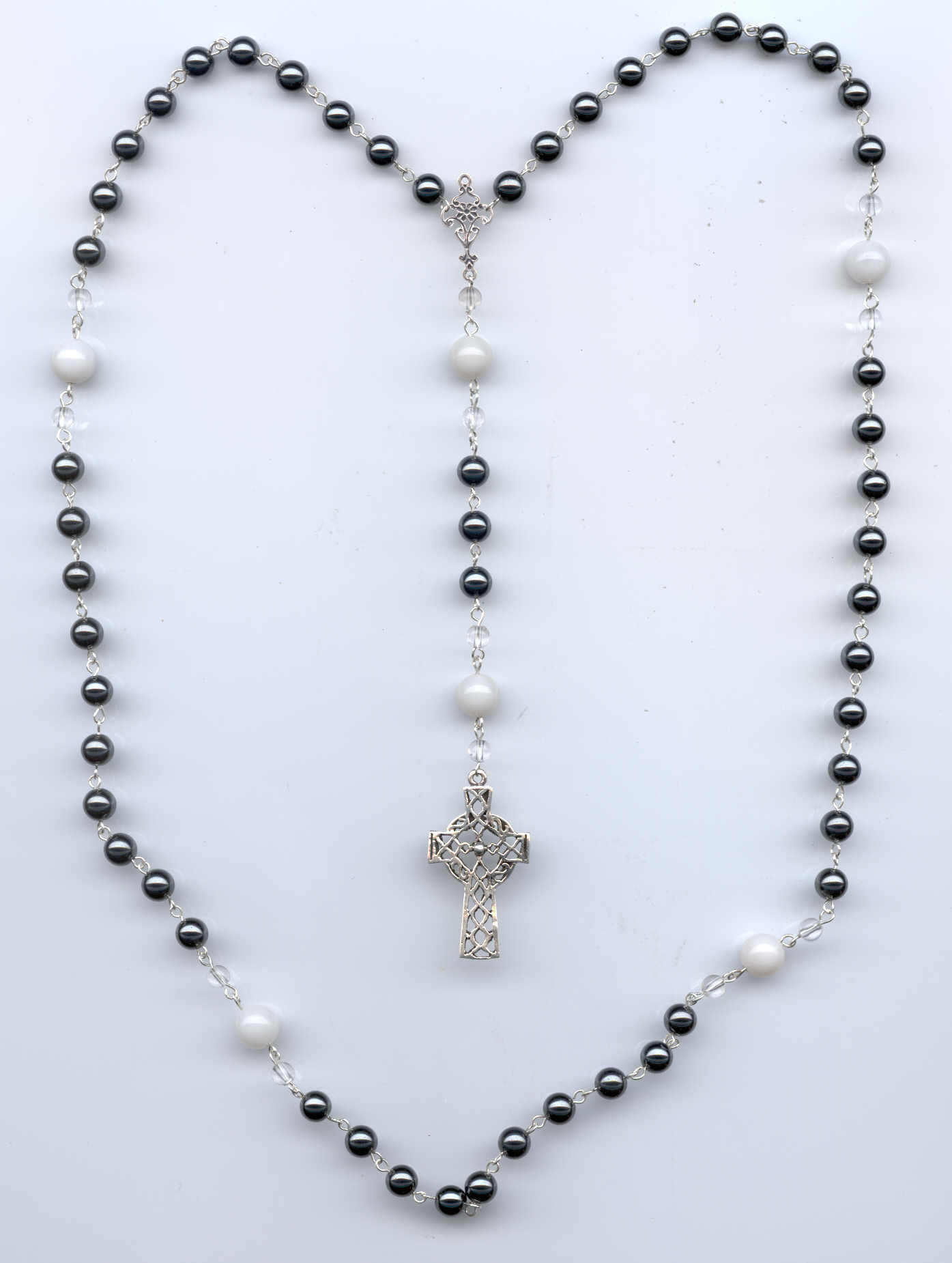 The rosary I made for Russell's dad's birthday, with a sterling silver cross, silver-plated center, and hematite, snow quartz, and clear quartz beads, all eBay finds :) Gotta love the fact that this rosary cost me less than $10 to make for all silver/stone materials.