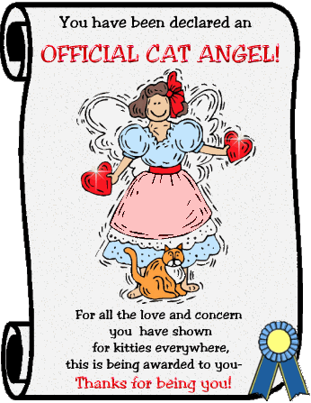 "You've done a terrific and beautiful job on it (your site). You have great cat gifs and stuff. Display my award with honor for which you have earned it. Congradulations and keep up the great work. I'll be sure to visit your site again to see what's new."