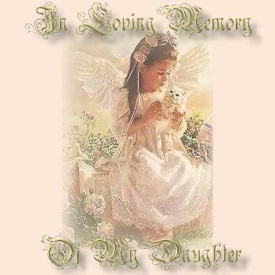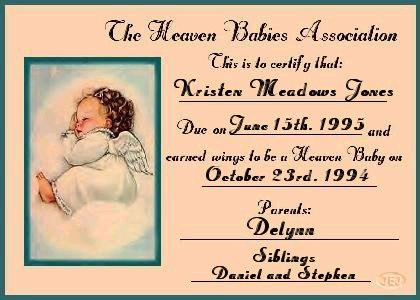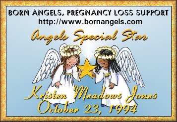 My Darling angel Kristen went home to be among the angels in October of 1994. I never got to know her at all. The very day I found out I was even pregnant with her I Started to lose her. They were not sure why but after doing some tests they discovered she was an etopic pregnancy. She was to have been our first child. I still Love and miss Kristen and she will never be forgotten at least not by me.