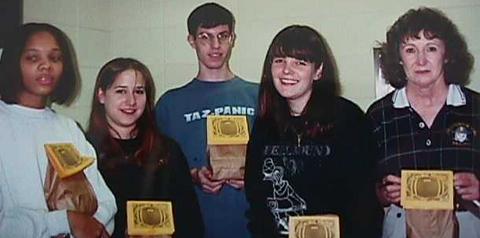Circa 1998: Andy and other Future Business Leaders of America hold goody bags of random junk food (and possibly apples) made for the football team, which were going to the state playoffs in the Georgia Dome. I look really young.