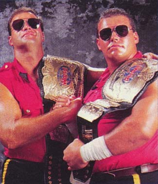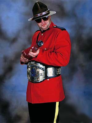 A wrestling mountie! It reeks of Canada! He'd use his little shock stick there and the WWF would insert a little "zzzap" sound everytime. He also sang his own theme song, in a very horrible fashion, which had the best lyrics in the world. "I'm the Mountie! I'm handsome! I'm brave! I'm strong!" I tried to find it online, but couldn't. He went away for a while, but came back as a member of the Quebecers, under his real name Jacques with partner Pierre. Their gimmick?