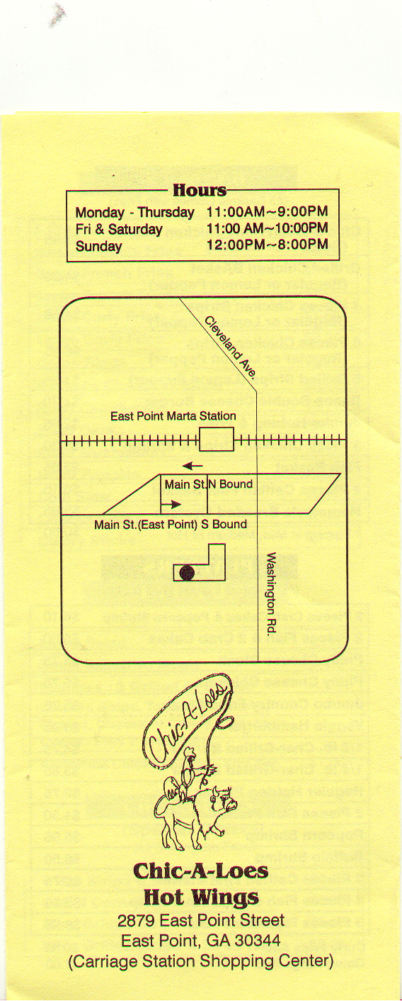 Chic-A-Loes Hot Wing Resturaunt is located in East Point Georgia in Carriage Station. Guest can choose from a wide variety of items on the menu, including of course Chic-A-Loes famous Hot Wings and Sauce! Located just minutes south of Fort McPherson military reservation Chic-A-Loes is a great place to stop and eat and has become something of a landmark in East Point and is known to soldiers around the world!