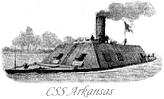 The fearsome Confederate ironclad ram Arkansas dueled the Federal gunboat Carondelet at the mouth of the Yazoo River in July, 1862. Northern courage and Southern ingenuity produced a drawn battle. The ram could not be damaged by shells, and the Federal boat, when shot through by cannon fire, drew alongside the Arkansas and sent a boarding party onto the decks of the ram. Once there, the daring Yankees were at a loss -- for the ram's crew merely retired below decks, slammed the iron hatches after them, and left no one to fight. A stalemate resulted.