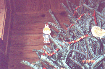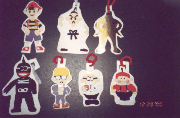 These are some homemade EarthBound Christmas Ornaments I made when I was in Mexico back in 1998. I had just gotten back into the game, and I couldn't play it so I brought my strategy guide with me and copied the pictures out of the book, and made ornaments. I made an ornament out of Ness, Jeff, Poo, Starman Jr, a Shark member, Apple Kid, and Dr. Andonuts. As you can probably tell, Mexico was kinda boring. It was fun having Christmas there though.