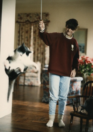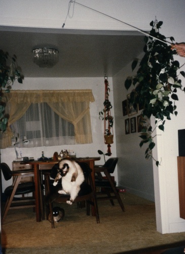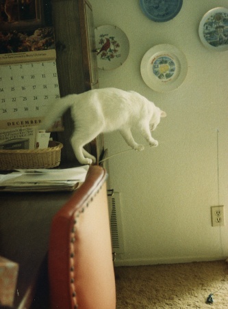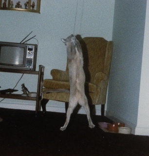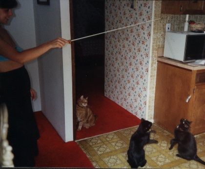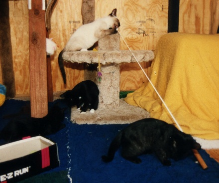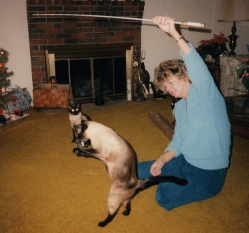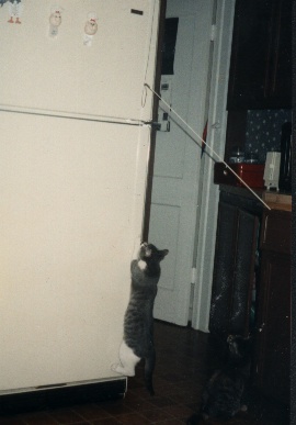 If I had saved all the testimonials I have received concerning the Kitty Tease they would reach the ceiling. At one time I had enough pictures, that people had sent me of their cats playing with the Kitty Tease, that I could have filled several albums. As it was I did manage to cull out 2 fat albums that I took with me when I was doing the cat show circuit. Those albums were a hit with the people attending the cat show. My hat goes off to the thousands of people that took the time to write me over the years. Some of those stories made me cry but most made me laugh or smile at least. That is one of the definite benefits of the mail order business, getting to read all those nice letters. Here is a sample of some of the pictures that I have received.