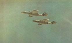 Poco después, el avión número tres avisa que avistó al buque. La alarma ya es general. E1 jefe de escuadrilla confirma la presencia de la amenaza y, al ver que el" buque cambia su posición para colocarse de proa, ordena eyectar las cargas externas-venían con los tanques suplementarios de punta de ala, los llamados "tips", que limitan la velocidad del Canberra, de 500 nudos, a sól1o 365 nudos-- y acelerar.