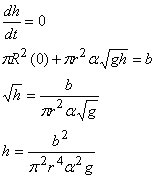 By setting dh/dt equal to 0 in the differential equation above, we find that the suggested equilibrium height will be 19.8 inches. This system was observed qualitatively with a pipe with 4 holes spaced out in 14-inch increments. The first two holes had water flow while the rest did not, meaning that the equilibrium height was in fact between 14 and 28 inches, as predicted by theory.