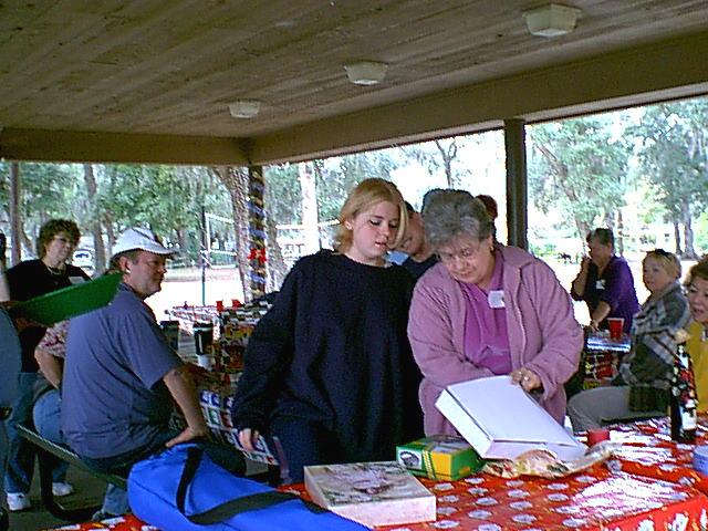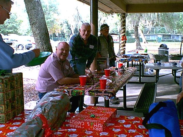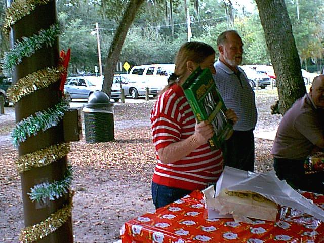 Our Secret Santa gift exchange was a lot of fun. Gifts ranged from a little square box with a voice inside that called for help, please let me out, it was controlled by a little switch on the outside of the box, bag chairs, fleece throw, a drill, candle in a ceramic Christmas container, Stationery and a license plate frame for the Gold Prospector to adorn his car tag with. All in all, everyone had a great time.