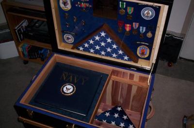 I received a very large sea chest at my retirement ceremony. It is a combination shadow box and sea chest. The shadow box portion is in the lid and the rest of the box holds a few of my old uniforms, certificates, scrapbook, and whatever else I want to store. It cost around $200.00 and was custom made for me by a guy in Silverdale, WA.