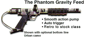 Spyder 2000 Features: Snap-Grip™ venturi bolt (patent pending), Built-in regulator with gauge, Slim double trigger, Low pressure chamber, Quick disconnect, field strippable T-Pin, 1 step, no-tool disassembly, Air maximizer value, Drop forward, Raised mini sight rail, Power feed, Bottom line set-up with steel braided hose, Aluminum body and trigger frame, External velocity adjuster, Filter system, Super-light trigger pull, Anti-double feed, Semi-auto action, Micro-polished, aerospace aluminum barrel with muzzle brake, M-16 Grip