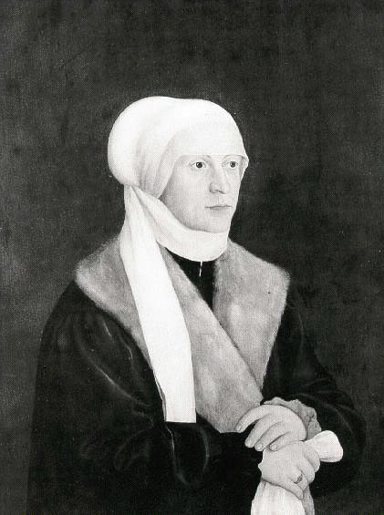 This is Sabine in the traditional dress of women during the German Renaissance. This was probably painted after she and her husband regained control of Wuerttemberg. It is radically different from the portrait in 1530,which was done in the Italian style. See the City of Moempelgard and portraits of Sabine's brother and son at The Family of the Archduchess. |