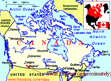 Below are a couple maps of Canada - with Swift Current added by me to it, so it's not exactly precise but close I believe - and the US for comparison. *Grins.* For those poor Americans that don't know much about Canada. Not that I know that much about US geography, but so far it seems to be I knowing more of them then they of us. Though I'm sure that there are many exceptions to this. *Noting here that the author means all of this as gentle teasing from a northern neighbour, so please no flames.*