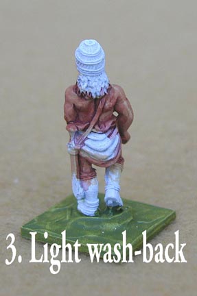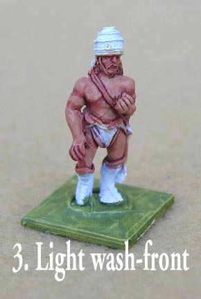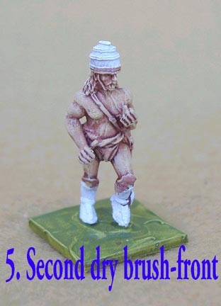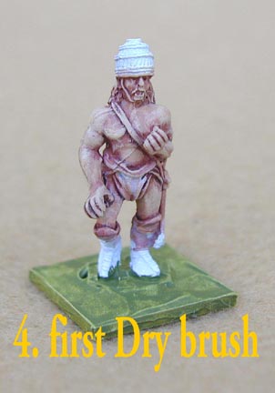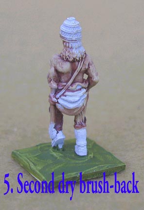 This step you could skip if you want to bang out zillions of guys ASAP. Okay... dry brush with the Ral Partha Suntan to 'clean up' all the mess we've made. Basically you want to reestablish the flesh to areas that you did an "ooopps" on. "Dark shadow color on the top of the shoulder...ooopps". If you are careful you might not have to do this step. I usually have to because sometimes I get impatient and make a quick job of #2. Go right to next step.