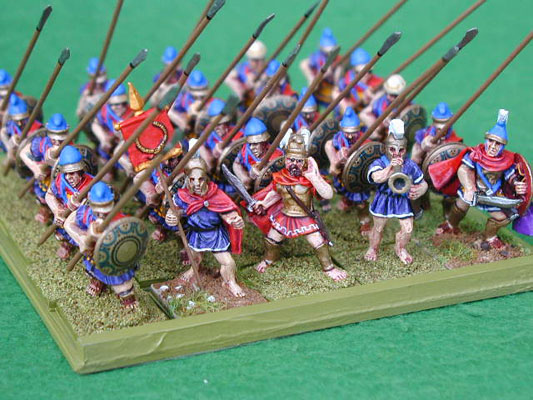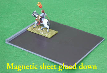 A fearsome Macedonian Phalanx advances toward the foe on a magnetized movement tray. All of the figures have their normal bases glued to metal bases. The magnetic sheeting holds the figures tighly. After the game, the tray with the unit on it is simply picked up and stored directly into the toolbox. |
