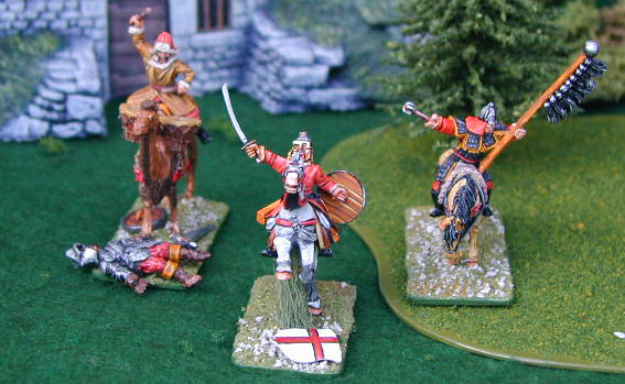 The Khan of my Mongol horde screams out his orders. Flanked on his right by a naccara drummer and on his left by theArmy standard bearer holding the infamous nine ox tail standard. Again these are all Old Glory figures. The drummer and standard bearer come in the command pack (ME-01). The General model is not a Mongol at all! I found him in a pack of Mongol mounted swordsmen. I cut off the tassle on top of his helmet and drafted him into my Mongol horde. The slain knight is an old Citidal figure.