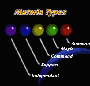 This section will explain the uses of any materia you find!In the magic section, the first spell is what you can cast when you first acquire the materia, to cast other spells, you must level-up the materia. The mastered level of materia is 5 when you achieve this, you can either cast a summon 5 times, use an ultimate type of magic, or use the ultimate command. Materia with one spell can only be used when it has been mastered. Also, when materia is mastered, it splits into a new level-1 materia. To get materia to level 2, you need 10,000 ap, 3, 20,000 ap, 4, 30,000 ap, and 5, 50,000 ap. You gain ap after winning battles, the amount varies according to enemy power. Anyway, these are all the spells and such that can be used.The number at the end is how much MP it takes.