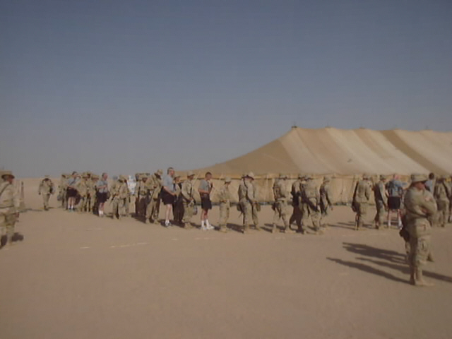 ![]() | This is a common sight around the kabal at least once per week. Usually on a Sunday evening, the local authorities and/or the chain of command sponsors a special, theme dinner. Anything from Chinese cuisine to Italian dishes to TexMex delights. I wonder what's for dinner this time... | Here is SSG Keith McGilvery with the answer. He is grilling/burning or just pretending to cook some good old hamburgers and hotdogs. Yummy! Regardless of the seemingly endless line, few in the kabal would pass up such a delicious meal! We spend enough of the week tolerating square eggs for breakfast, MREs (Meals Ready to Eat) for lunch, and canned foods for dinner. | ![]() |