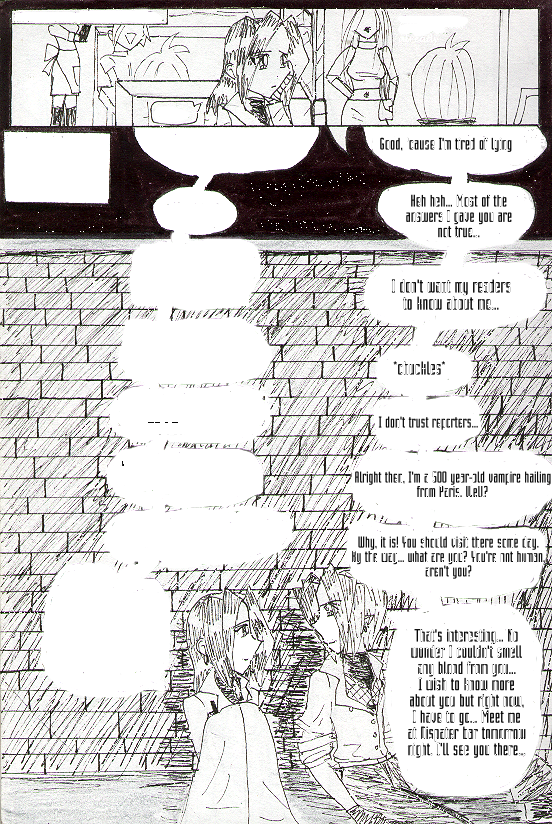 God, this sucks... I'm too lazy to draw out the whole chatting/interviewing scene. Anywayz, this is how you read those long chain of speech bubbles: