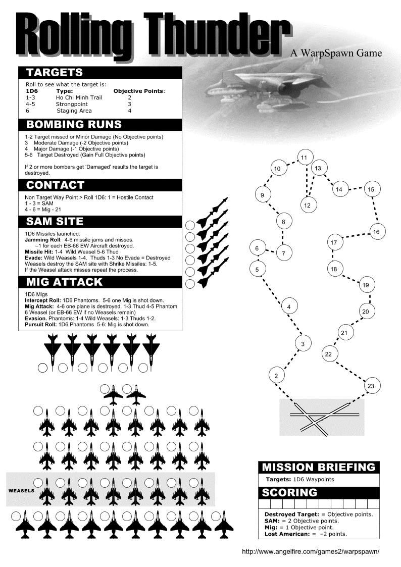 INTRODUCTION Solo Dice Game. Simulation of an American Rolling Thunder Bombing Mission during the Vietnam War circa 1966. MATERIALS Paper, pencil, 1-2 six sided dice, nobody to play with. ROLLING THUNDER STRKE FORCE COMPOSITION 16 F-105 Bombers (Thuds) 8 F-105 Wild Weasels 10 F-4 Phantoms (Fighters) 2 EB-66 EW Aircraft (Jamming) FUEL LIMIT After 12 turns the planes begin to run low on fuel and start turning back. All remaining Bombing targets (Turns 13-24) are considered to be on the way back. The Planes have returned and the mission is over on turn 25. ACQUIRING TARGETS The first target will be in range on turn 1D6. After a target has been bombed, the next target will appear in another 1D6 turns. TARGET TYPES Roll to see what the target is: 1D6 Type: Objective Points: 1-3 Ho Chi Minh Trail 2 4-5 Strongpoint 3 6 Staging Area 4 BOMBING RUNS Each bomber can make only one bombing run per game. When reaching a target decide how many of your Thuds will drop their loads. For each plane that bombs roll: 1D6 Result: 1-2 Target missed or Minor Damage (No Objective points) 3 Moderate Damage (-2 Objective points) 4 Major Damage (-1 Objective points) 5-6 Target Destroyed (Gain Full Objective points) If 2 or more bombers get ‘Damaged’ results the target is destroyed. CONTACT On every turn you are not bombing roll 1D6. On a roll of 1 on 1D6 the strike force encounters hostile forces. Roll 1D6 again: On a roll of 1-3 on 1D6 a SAM site is encountered. On a roll of 4-6 on 1D6 a flight of Mig-21’s are encountered. SAM SITE 1D6 Missiles are launched at the Strike Force. For each Missile make a Jamming Roll of 1D6: On a roll of 4-6 the missile is jammed and misses. Get a –1 for each EB-66 EW Aircraft destroyed. For each missile not jammed roll 1D6 to see which kind of plane it attacks: 1-4 Wild Weasel 5-6 Thud An attacked plane may try to evade. Wild Weasels evade on a roll of 1-4 on 1D6. Thuds evade on a roll of 1-3 on 1D6. Planes that do not evade are destroyed. After this barrage the Weasels will destroy the SAM site with Shrike Missiles on a roll of 1-5 on 1D6. If the Weasel attack misses repeat the process. MIG-21 FLIGHT 1D6 Migs will make a single pass. 1D6 of the Phantoms will get to make Intercept Rolls. To Intercept roll 1D6: On each roll of 5-6 on 1D6 one Mig is shot down. Next the surviving Migs get to attack. For each roll 1D6: On a roll of 4-6 on 1D6 one American plane is destroyed. Roll 1D6 to see which type: 1-3 Thud 4-5 Phantom 6 Weasel (or EB-66 EW if no Weasels remain) An attacked plane may try to evade. Phantoms evade on a roll of 1-4 on 1D6. Wild Weasels evade on a roll of 1-3 on 1D6. Thuds evade on a roll of 1-2 on 1D6. Finally 1D6 of the Phantoms will get to make Pursuit Rolls. To Pursue roll 1D6: On each roll of 5-6 on 1D6 one Mig is shot down. You can’t intercept or pursue with more phantoms than you have. SCORING Keep a running tally of points while you play. Start with 10 Objective points. Each Target bombed adds its listed Objective points. Each SAM site destroyed is worth 2 Objective points. Each Mig shot down is worth 1 Objective point. Every American plane lost is –2 points. GRAPHICS Graphic at the top of the page done by: Mike Marinos (mikemarinos@yahoo.com) THOTH MODULE by Zak The new Thoth module for Rolling Thunder is now available (while not yet in the CardSets page) at http://digilander.iol.it/zak965/thoth/rt.zip The desktop has been completely redesigned by Mike Marinos and is really worth a look. Please note that you need the latest Thoth release (1.5.0) to use the "buttons" on the desktop - key "1" rolls a D6 while key "2" determine the target type. The rules are also available in PDF format with the usual "F2" key.