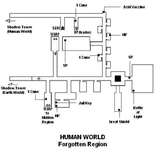 As soon as you appear here, turn left and look down to pick up a Cune. Proceed N to the main corridor. Immediately to your left is one exit to SHADOW TOWER and back up into the prior HUMAN WORLDs so use this later. If you turn right (East) you will see the main corridor and a shaft that branches off to the North. That branch leads to a point that you will be able to WARP INTO this region later, but you cannot get to it because it is up above the corridor and you have to drop down into this area from that WARP point. For now, proceed down the corridor to the E. You will not encounter any creatures in the corridor AT THIS TIME. The main corridor turns N after you pass 2 locked jail cells on your right. Follow it N all the way to the end (you will pass many locked jail cells) where it makes a right angle turn to the left (W). The first branch you come to on the left leads to an Hpotion trader, the next branch you come to leads to the SAVE point for this level. USE IT. The corridor continues to another door to SHADOW TOWER and the Cursed Region. Use this after you finish this level. Now go back down the main corridor to the right angle turn (now turning South) and face the North Wall. Press X to open the secret door here and watch the corpse fall. You may obtain the Acid Vaccine prior to opening the secret door or after. Now turn S and go to the first corridor branching off to the right after you pass another locked cell. Open the secret door at the end of the corridor and walk up to one of the 2 chests at the far end of the room.