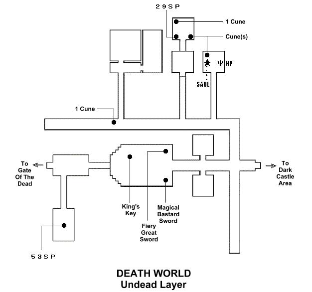 Back to the Main corridor and head W to the next-door but not before encountering 2 Hell Hunters in the Corridor. One of them Drops a torch (whoopee!) that is useless in these levels. Go figure. Open the next door, and there is another Clawhead that can Drop the Keenest Battle Axe. Enter the next room. This room is currently empty but will have opponents after you get to the heart of this level (2nd Hint!). Now go to the N wall, open the secret door and pick up the 2 Cunes and the Soul Pod +29. Back to the Main Corridor.