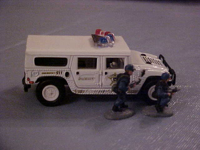 A Johnny Lightning police Hummer provides cover for some members of Fat Cat's US SWAT team.