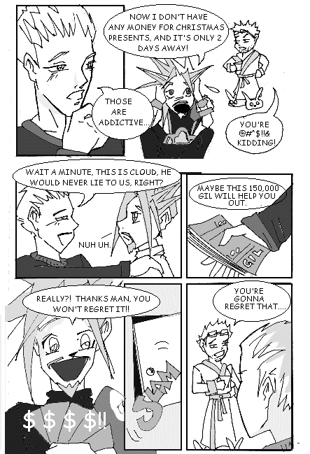 Haha I'm sure that's all of 'em. I dun usually use loadsa addresses it's already hard enough fer me to remember 'em ^^,D!nok,dinok006@hotmail.com yall probably forgot about me ...lol,Thursday 15-Feb-2001 23:17:51,,well anyways i thought id post something cuz i havent in so long yall probably thought i was dead er somethin.. lol also i just wanna say how tired i am of the tifa vs aeris thing... readin the same arguements...its gettin old and umm what was i gonna say.. oh yea i just got a playstation 2 and alls i gotta say is wow.. im playin vagrant story on it and it looks sooo much better on 2 than the first. cost me 500 dollars for the thing though.. guess i wont be goin shoppin for a while... no more money... ::sob:: im out later,tiffany,sade_fox@yahoo.com Welcome Back!,Friday 16-Feb-2001 12:02:59,,Ya I was beginning to think something happened. Glad it didn't! Congrats on the PS2 I gotta wait another month til' they get more shipments in...,Cloud612,cloud612@tifa.zzn.com HEY TIFF!,Friday 16-Feb-2001 13:41:43,,i wanna PS2!!!!!!!!!!!!!!!,fins, hey!!!,Friday 16-Feb-2001 17:53:23,,Playstation 2.....mmmmmmmmmmmmmmmm.....*drools*,Caroltrue, Re: hey!!!,Saturday 17-Feb-2001 00:43:48,,thanx for the warm welcomes i feel so loved lol ,tiffany,sade_fox@yahoo.com CAROLTRUE!!!!!,Thursday 15-Feb-2001 22:23:15,,Hey that little mini-me thingy isn't working waahhh!!!! I put it on the page and it didn't move so I linked it to the address it holds in the e-mail you sent me and it showed up for a while but now it doesn't and I saved the e-mail too!! What do I do????,Cloud612,cloud612@tifa.zzn.com ZACH!!!!!!,Friday 16-Feb-2001 17:51:13,,I dunno! *panics* Um.........uh........I'll look into it! *Frowns*.....wait a minute....could you check my site to see if the one of me is working? 'Cause I can't tell it might just be reading the animation from my hard drive.....if it isn't working I think I know the problem. If it is......*shrugs shoulders*,Caroltrue, (^____________________ ^),Tuesday 13-Feb-2001 15:46:25,,Yay! I'm off to make animations now!..............Maybe I'll have one of Aeris being burnt at the stake? Gyahahahaha...ulp! I remeber what I wanted to say now.........I wanna change my evil laugh I don't like it. I just used it because 'some people' *glares around message board* already took the good ones. Hrmph! Anyone got any ideas 'cause I'm stumped.,Caroltrue,caroltrue@hotmail.com How bout -"hehehe *snort*"-?,Tuesday 13-Feb-2001 19:34:26,,,Cloud612, Re: How bout -"hehehe *snort*"-?,Wednesday 14-Feb-2001 06:48:54,,Hehehe yeah! You can snort Caroltrue! ::bursts out laughing:: Kwehehehe,Min, Re: Re: How bout -"hehehe *snort*"-?,Wednesday 14-Feb-2001 15:55:41,,(_) Not funny! *sobs* your always mean to me!!! *sniff sniff*(;_;)!!! Waaaaaaa!...............But whoo hoo! Cool ramble except......I was going to use Vincent! Waaaaaaaaaaaaaaaaaa!!!!! See your all meanies!!! *runs out crying*,Caroltrue,caroltrue@hotmail.com Re: Re: Re: How bout -"hehehe *snort*"-?,Wednesday 14-Feb-2001 20:45:15,,I'm sorry! I didn't mean it as being mean it was just a suggestion but you don't have to like it! As for Vincent go ahead and take him! I'll just swap Rude into his place.