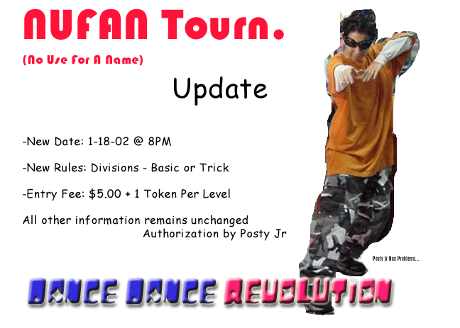 Um...I have some bad news. Really, really, crappy bad news. As of February 28, 2002, the people who let me use ddrcc.net aren't gonna give their service away anymore (cuz of the current market conditions, or some BS right now). Meanin, if you're used to ddrcc.net, you better do one of two things. Get used to typing in https://www.angelfire.com/~ddrcc/...it's just a real big hastle. It's 5 bucks a month plus a 10 dollar sign up fee to go with Angelfire as our server and domain name...I can't very well accept money from the website because I don't have a credit card (Damn you Paypal!) so I'll be holding "fund raisers" hahaha...meaning I'll be out @ PPP begging for cash. Or somethin similar, I'm not sure...somebody help me with an idea here!