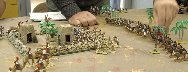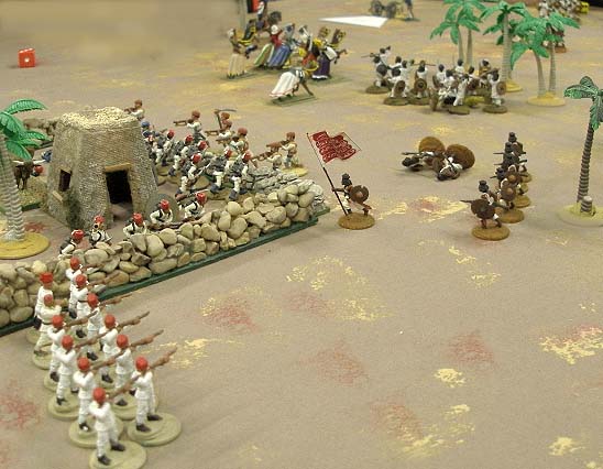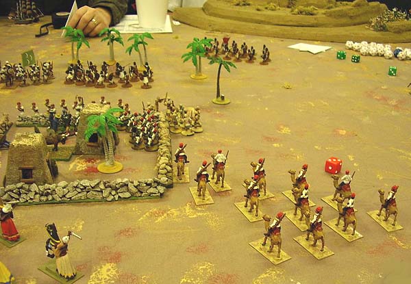 Dervishes crowd in against the wall. On the right, the Egyptian camelry have dismounted to fire more effectively. Note the bullock in the compound. He could have been a "Key figure" to absorb a hit from the attacker's fire. However he came through the battle unscathed.