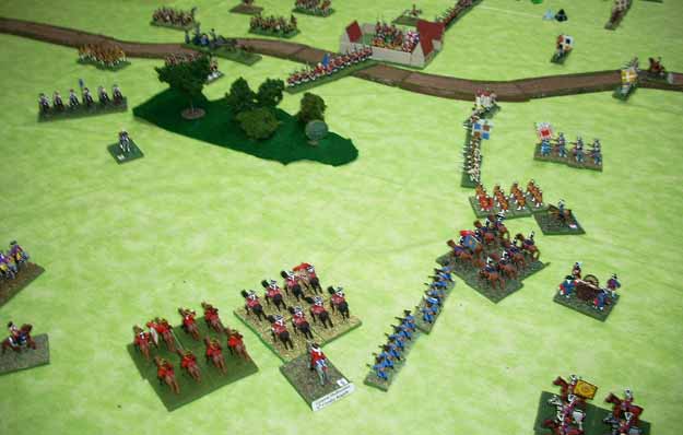 Cavalry and light troops in action on the French army's extreme left. The village of Brinkley shows at the top of the image. The French, with all of the elite battalions deployed against Huntley and the Chancellor farm, never assaulted Brinkley.